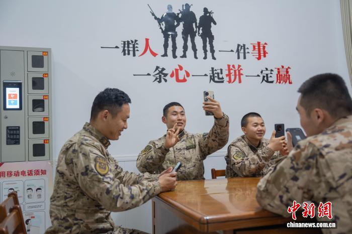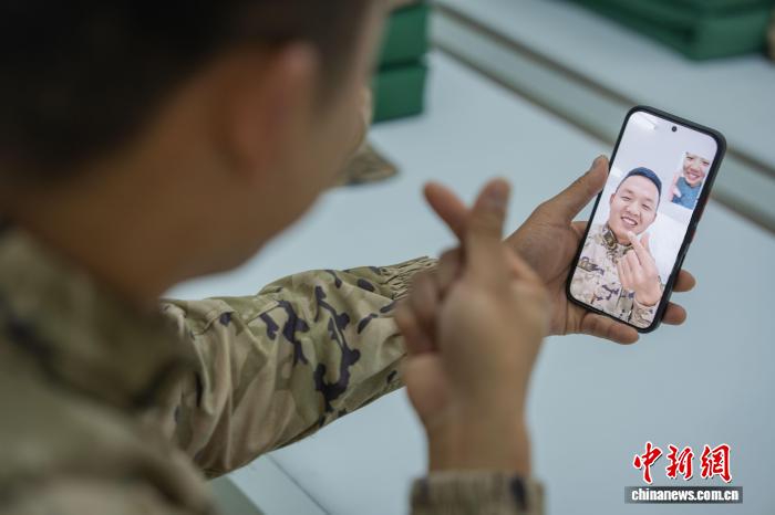 图为武警民卒经由过程脚机瞅频背家人奉上元宵节歌颂。施朝洲 摄